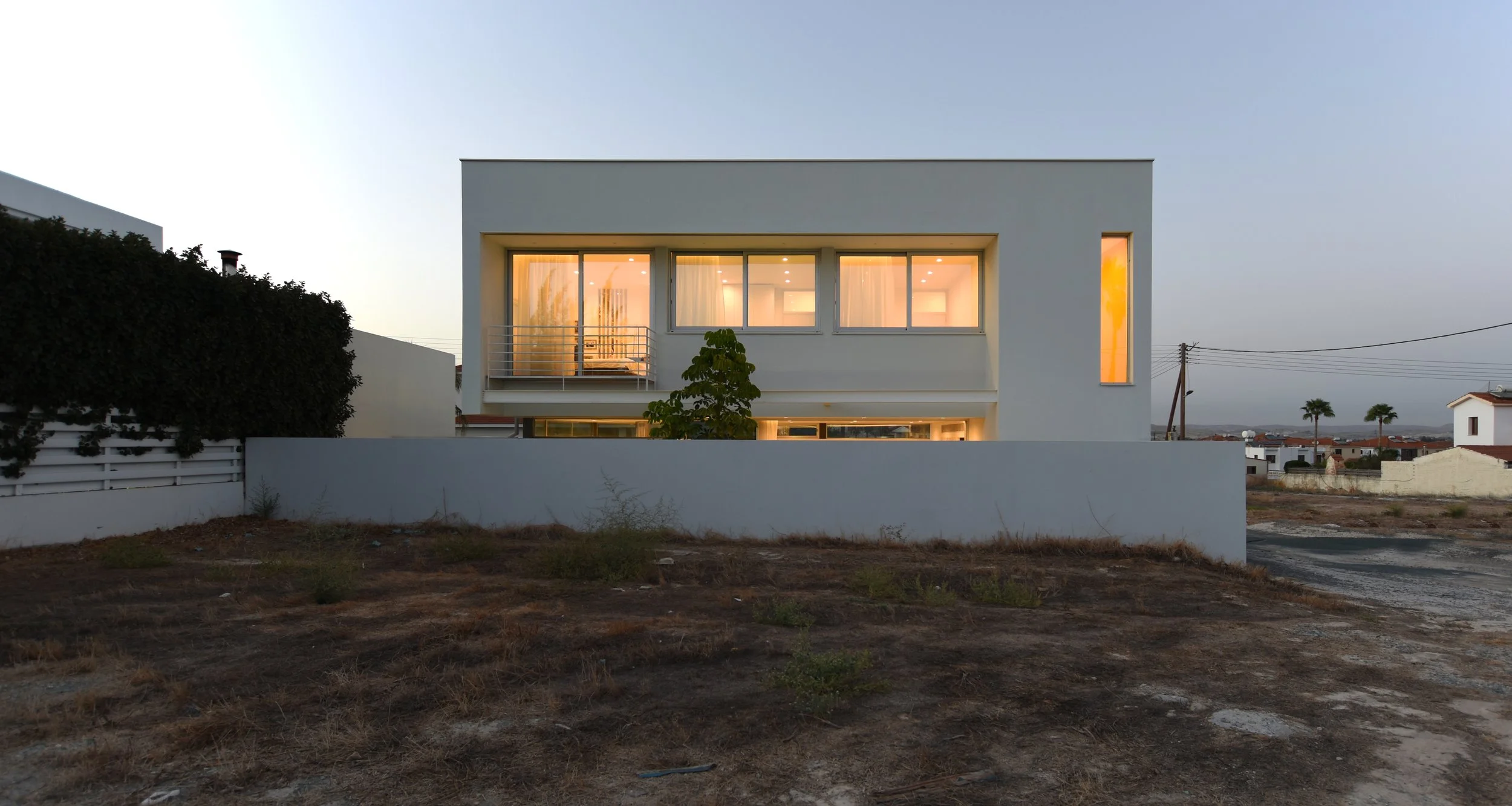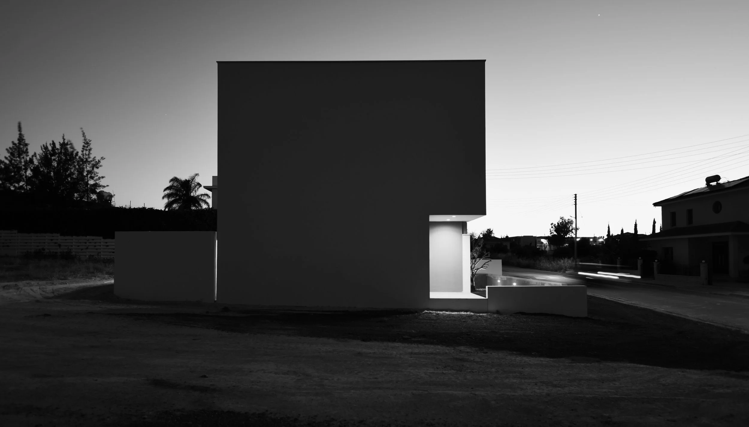 Το ορθογώνιου σχήματος μισό οικόπεδο και η πρόθεση για ιδιωτικότητα και αξιοποίηση του υπαίθριου και ημιϋπαίθριου χώρου ζωής, οδήγησαν στη σύνθεση ενός «κουτιού» που στρέφεται προς τον ευνοϊκό, νότιο προσανατολισμό, με ελάχιστα ανοίγματα προς τον δημόσιο δρόμο/βορρά.
