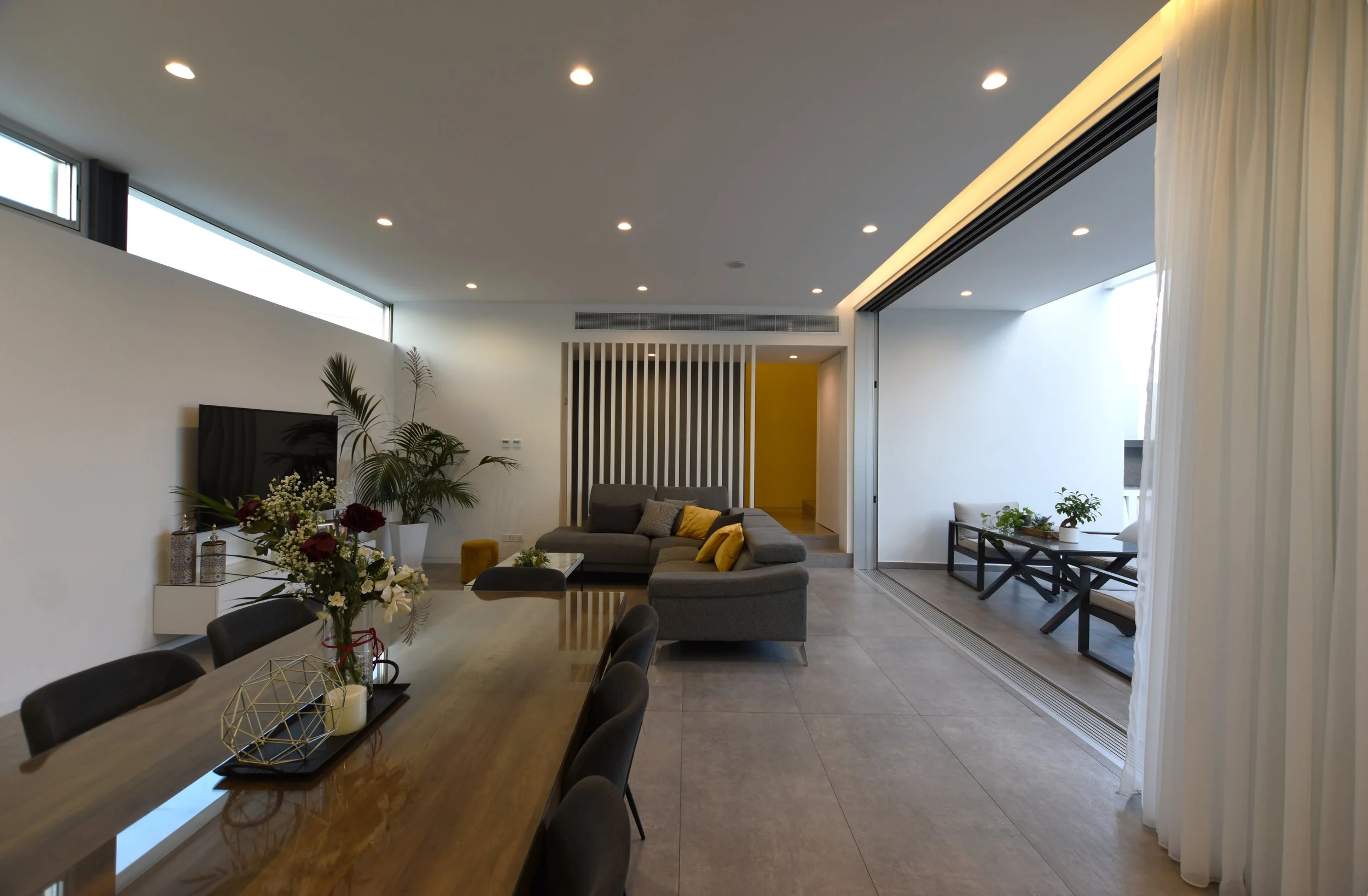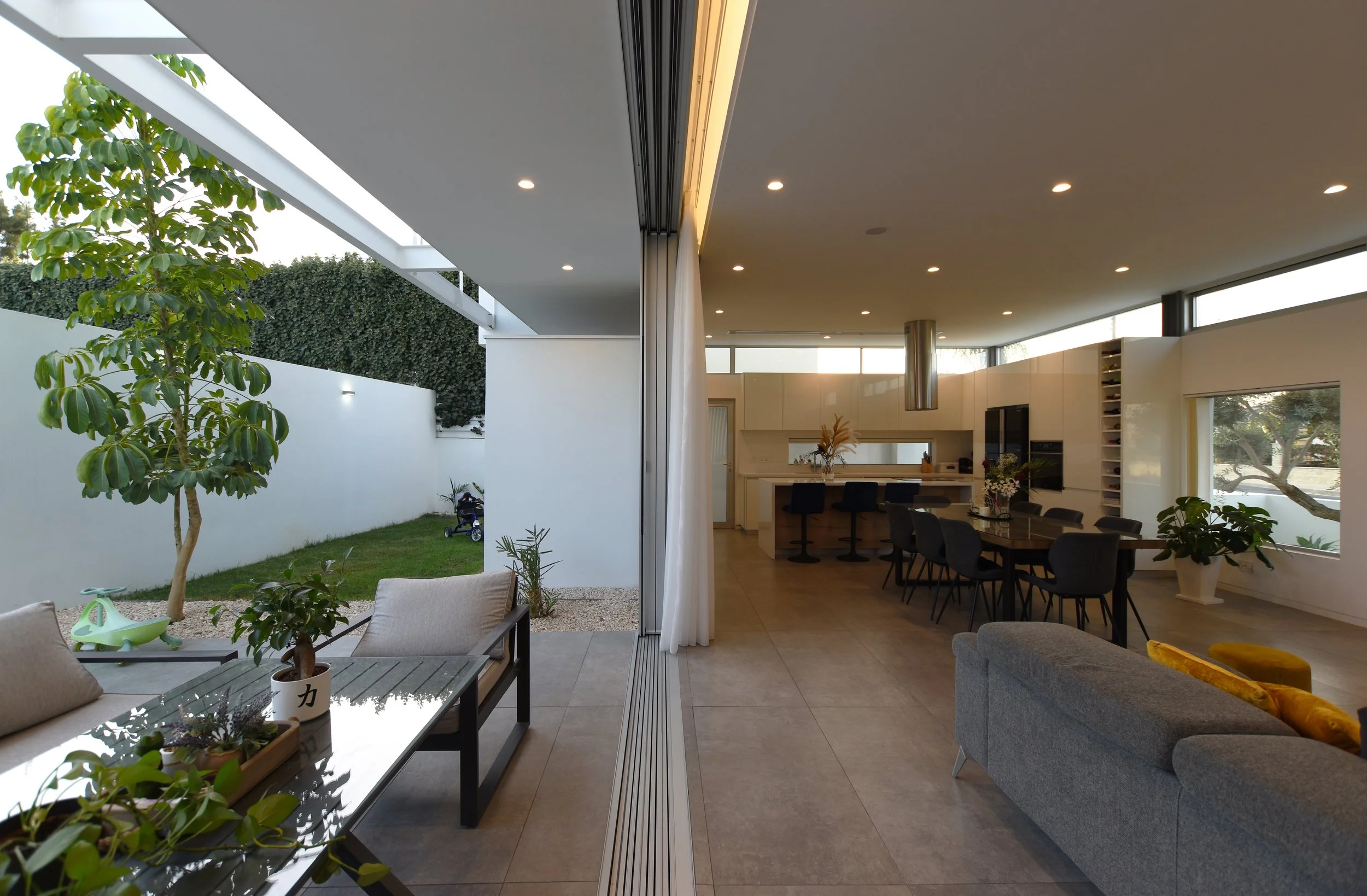 Οι χώροι διημέρευσης στον ενιαίο χώρο του ισογείου ανοίγονται γενναιόδωρα προς την περίκλειστη αυλή, διευρύνοντας την αίσθηση βάθους και ενθαρρύνοντας την καθημερινή διαβίωση στον ημιϋπαίθριο και υπαίθριο χώρο και στον κήπο. Τα όρια του καθιστικού και της τραπεζαρίας φτάνουν μέχρι τον ψηλό «μαντρότοιχο», ενώ, ταυτόχρονα, τα μεγάλα συρόμενα υαλοστάσια, στραμμένα προς τη μεσημβρία, επιτρέπουν στο φως του ήλιου να διεισδύσει σε βάθος τον χειμώνα και να συμβάλλει στην καλύτερη βιοκλιματική συμπεριφορά του κτηρίου.