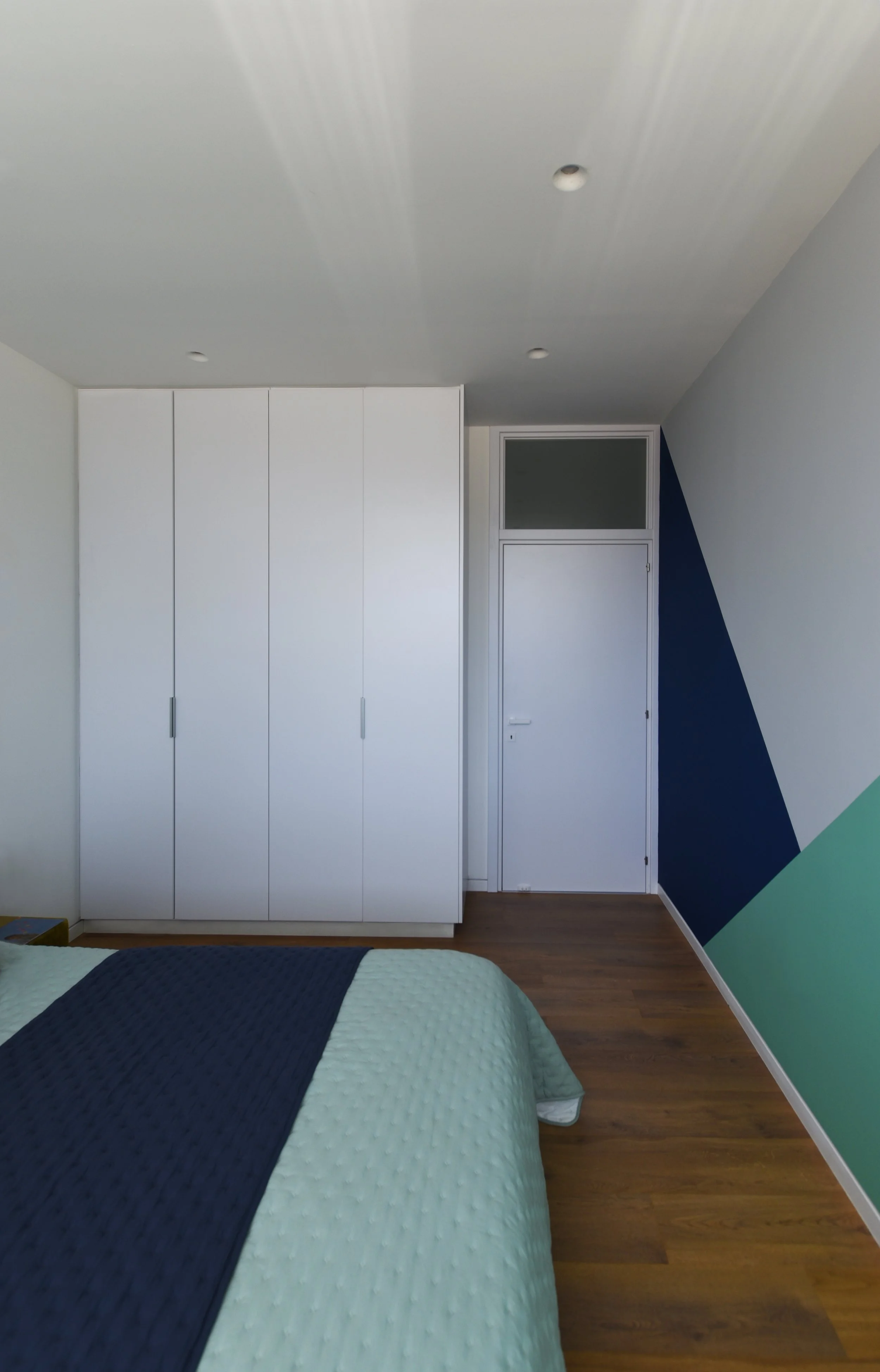 Στο δεύτερο μισό του «κουτιού», στον όροφο, τα δωμάτια προσανατολίζονται στον νότο, ενώ οι βοηθητικοί και υγροί χώροι στον βορρά. Ο διάδρομος που χωρίζει τις δύο ενότητες φωτίζεται στο βάθος από τη σχισμή που λούζει με φως τον κίτρινο τοίχο, ενώ ενδιάμεσα φωτίζεται διάχυτα από τους φεγγίτες των υπνοδωματίων. Τα ανοίγματα των χώρων ύπνου προστατεύονται από τον καλοκαιρινό ήλιο τόσο μέσω των προβόλων, όσο και μέσω των βενετικών σκιαδίων, τα οποία με την τοποθέτησή τους, ολοκληρώνουν συνθετικά τον όγκο του ορόφου.