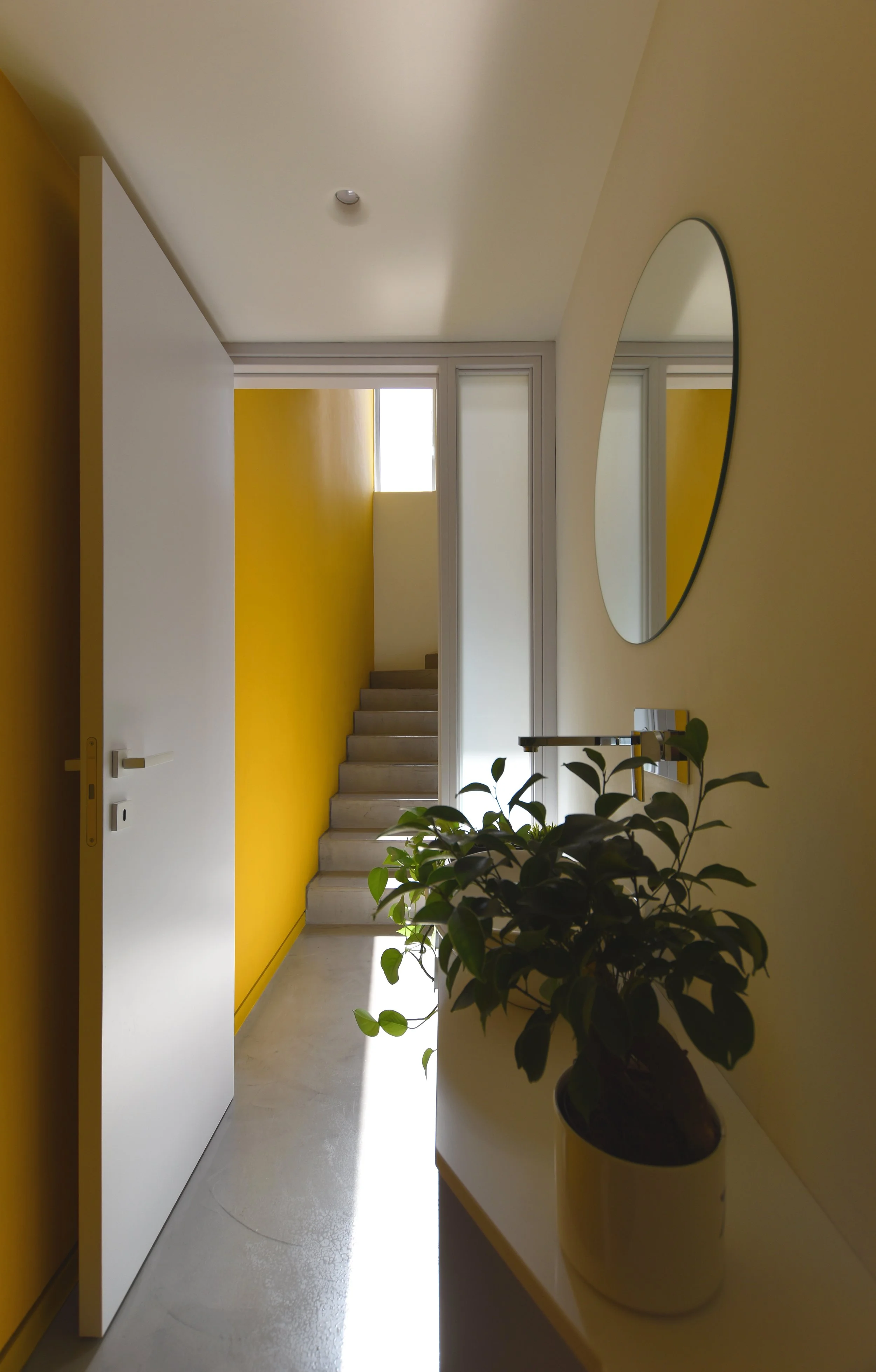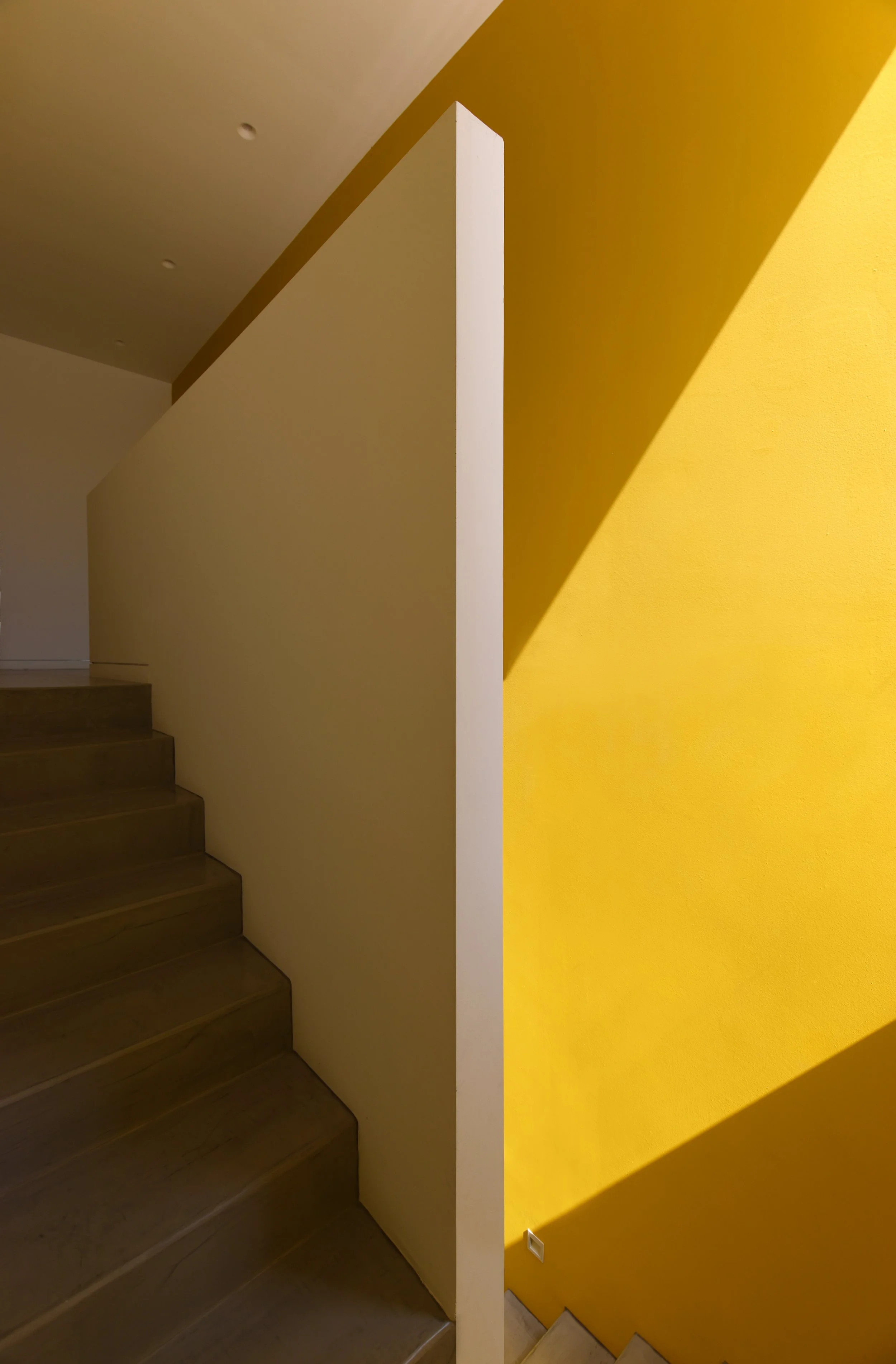 Ο κίτρινος τοίχος στην εσωτερική πλευρά της «τυφλής» όψης, που συνεχίζεται και κλιμακοστάσιο σε όλο το ύψος του κτηρίου, λειτουργεί ως συνεκτικό στοιχείο των δύο επιπέδων της κατοικίας, εντείνοντας το βάθος και δημιουργώντας ποικίλες εντυπώσεις κατά την κίνηση των ενοίκων.