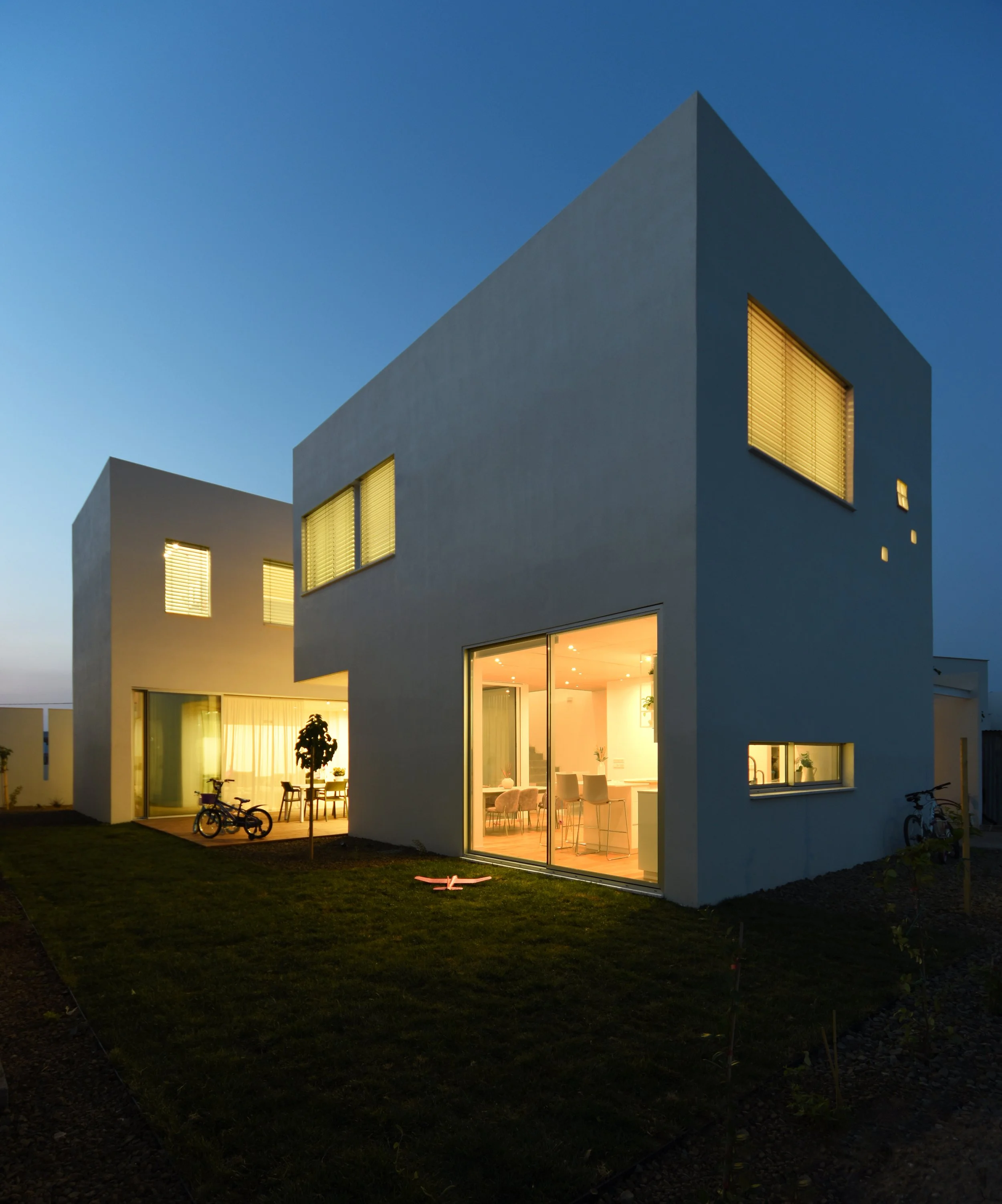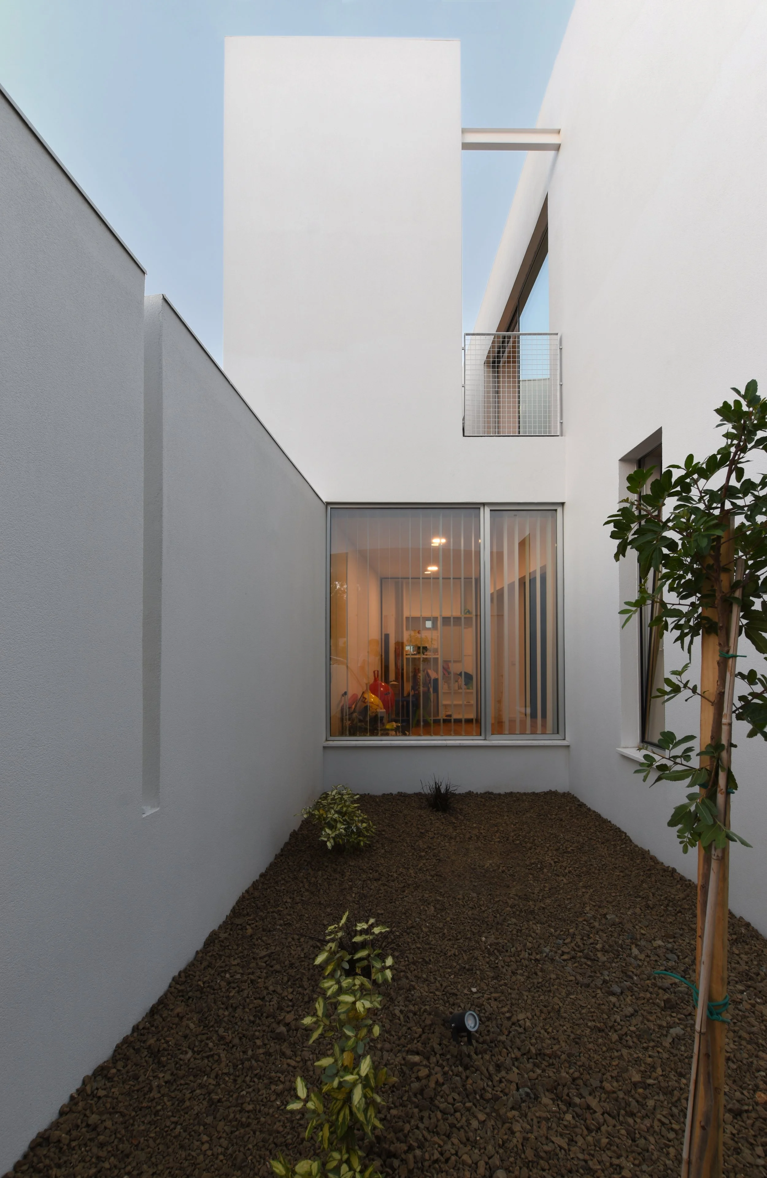 Access to the house is through the garden, with no strict separation between public and private space. Movement along the mostly closed exterior wall of the ground floor leads to the entrance, which is marked by the staircase wall. This wall “rises” to define the entrance and continues along the façade, becoming the boundary for the upper floor and the private patio of the main bedroom.