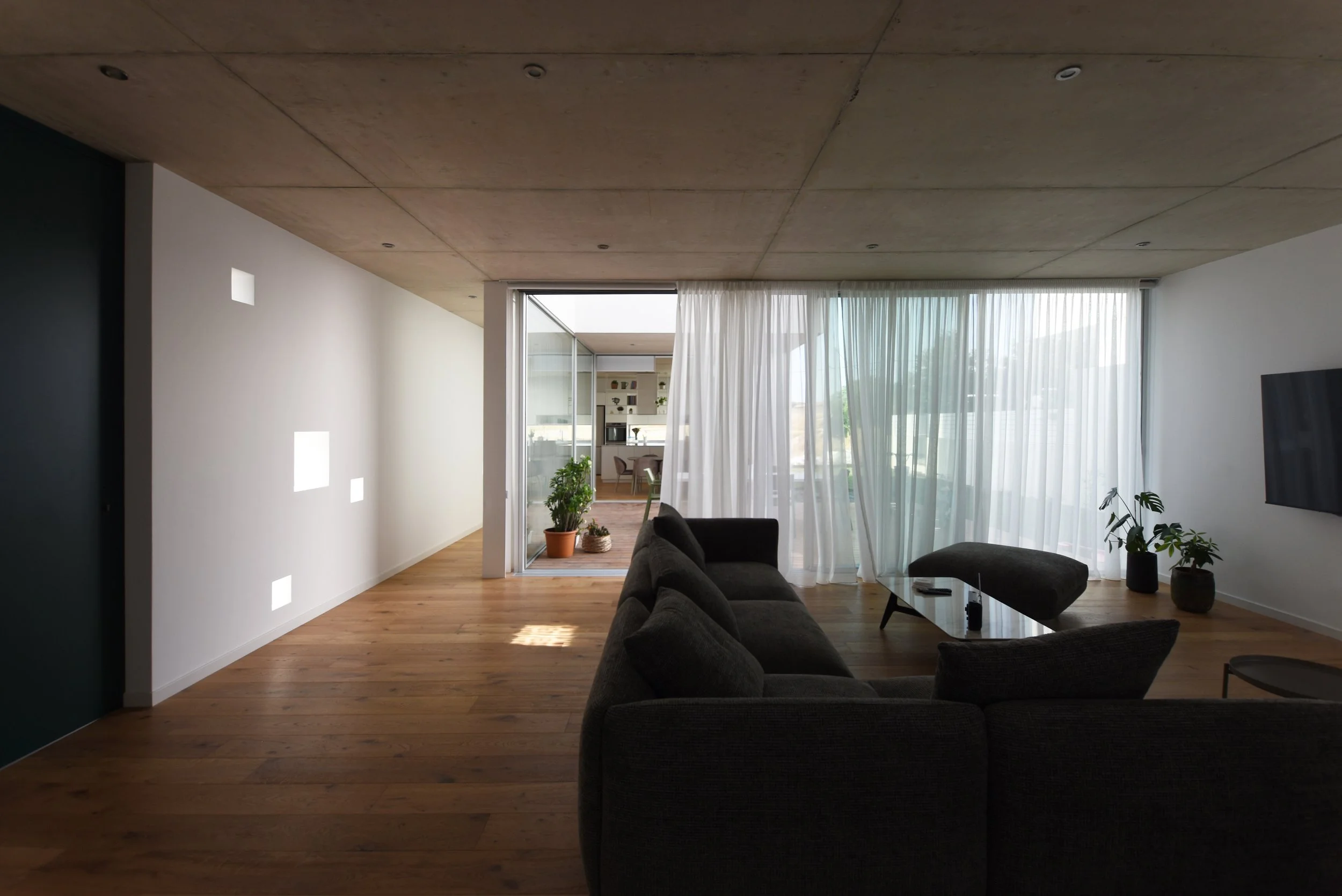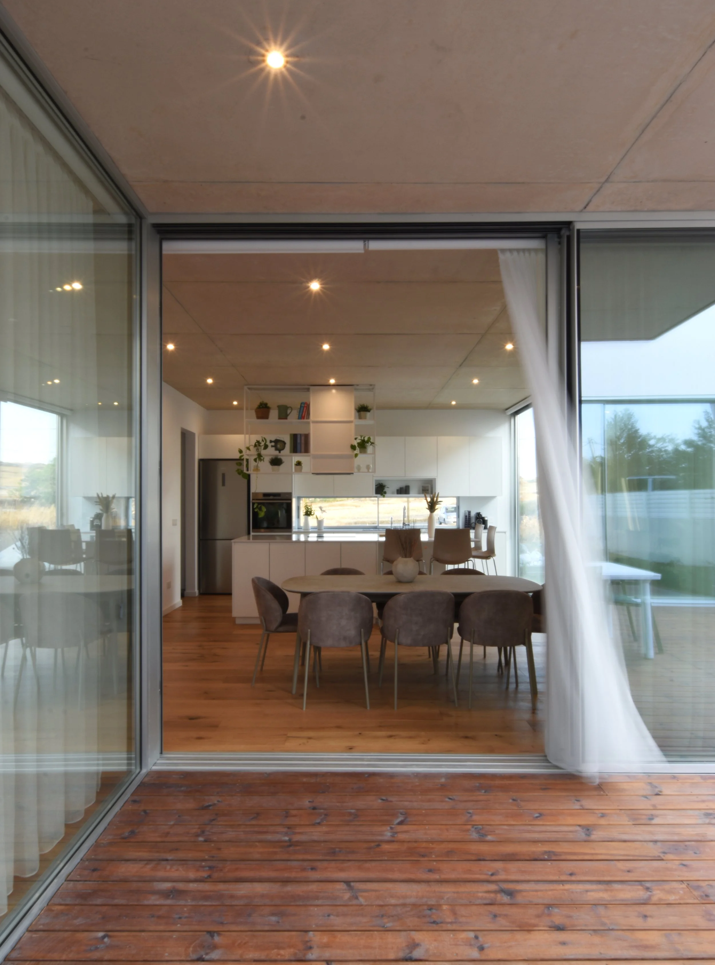 The central courtyard, partly covered and partly open, forms the core around which the living spaces are organized. The living room opens toward the veranda, through large south-facing doors, while the dining area and kitchen are positioned on the opposite side. Glazing around the courtyard enhances the visual continuity between indoor and outdoor areas, and sliding doors allow for complete spatial integration and fluidity within the ground floor.