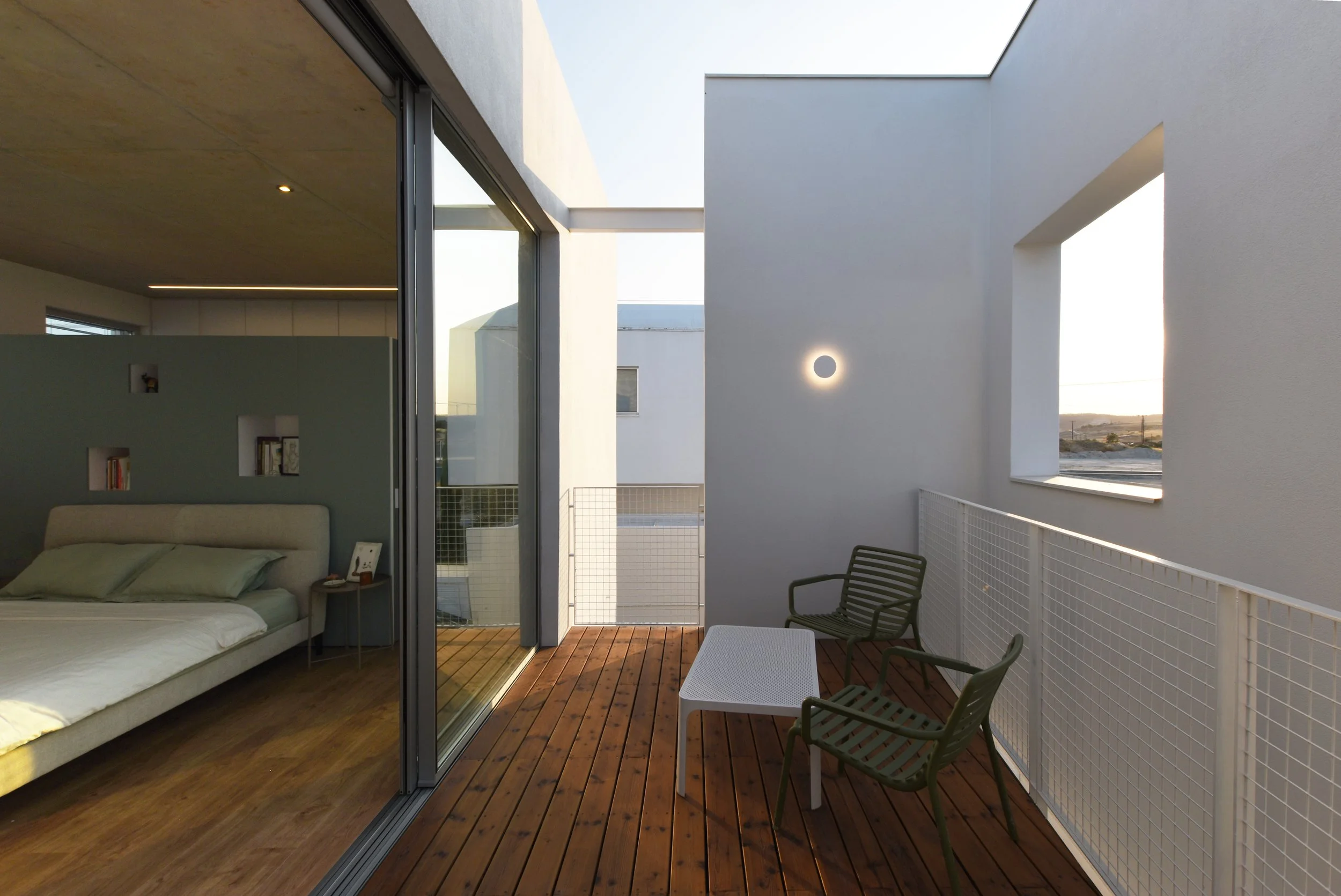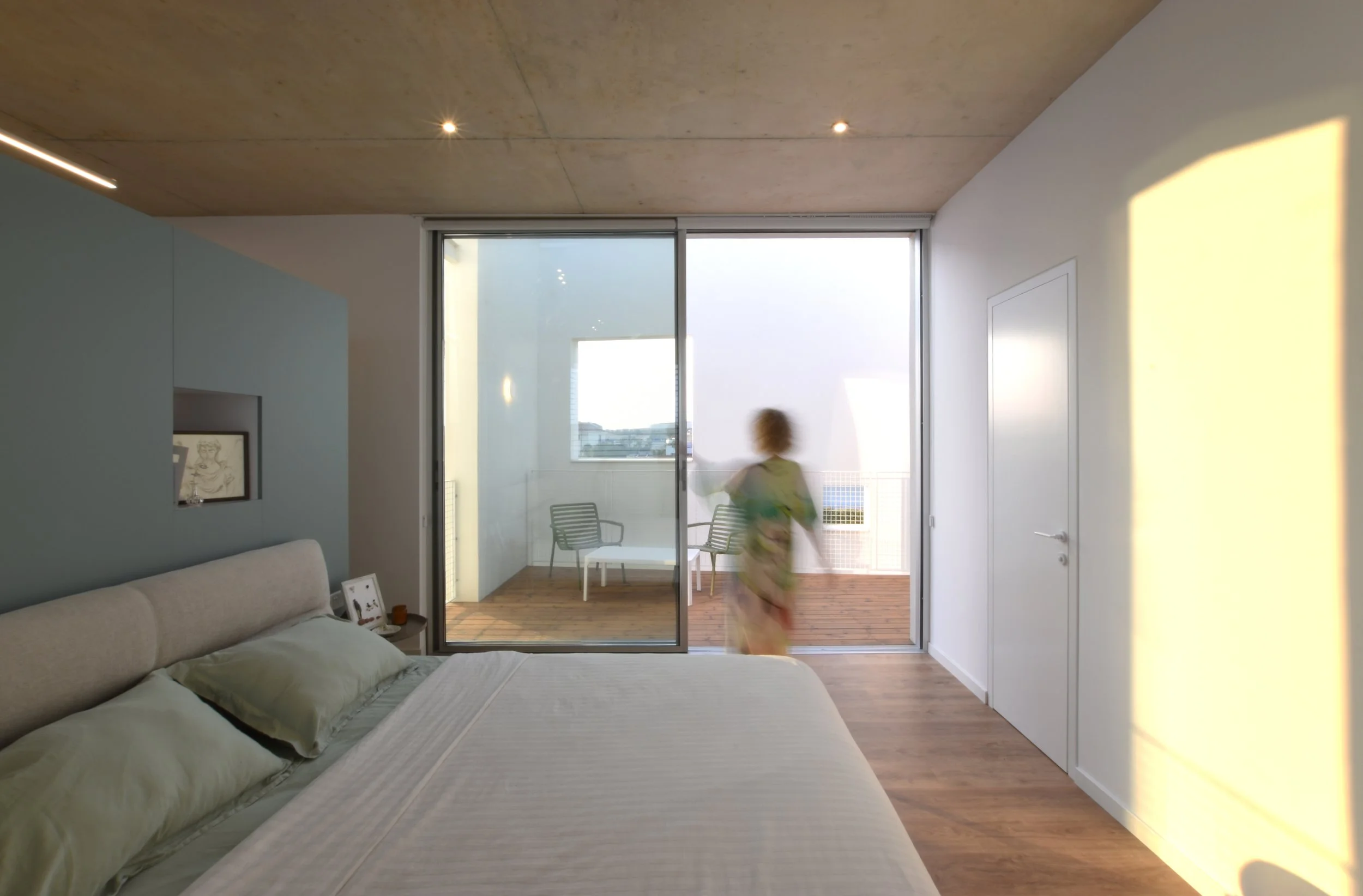 The upper floor is divided into two distinct zones: one for the parents and one for the children. The master bedroom is composed of loosely defined areas that flow into one another. A wardrobe wall serves as a backdrop to the sleeping area, acting as a low partition that maintains openness while providing separation. To the north, the room extends both visually and spatially toward a private veranda, offering a sense of enclosure along with framed views of the sky and the surrounding landscape.