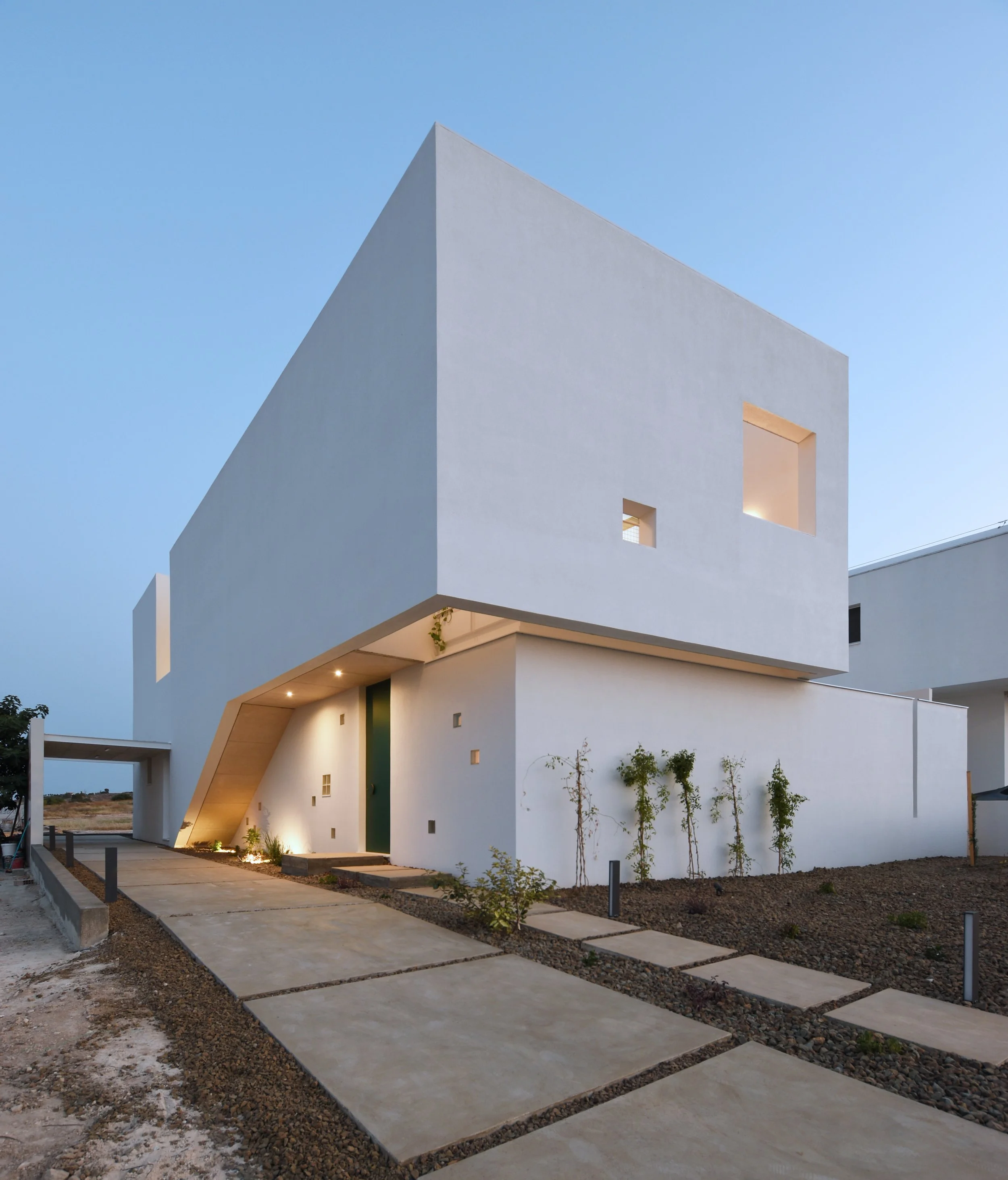 Η πρόσβαση στην κατοικία γίνεται μέσω του κήπου, χωρίς να μεσολαβεί οποιοδήποτε αυστηρό όριο μεταξύ δημόσιου και ιδιωτικού. Η κίνηση δίπλα από τον εξωτερικό –σχεδόν– τυφλό τοίχο του ισογείου ορίζει το κατώφλι που επιστεγάζεται από τον τοίχο του κλιμακοστασίου, ο οποίος «ανασηκώνεται» για να σηματοδοτήσει την είσοδο και να συνεχίσει στην πρόσοψη ως το όριο του ορόφου και του ιδιωτικού αιθρίου του κυρίως υπνοδωματίου.