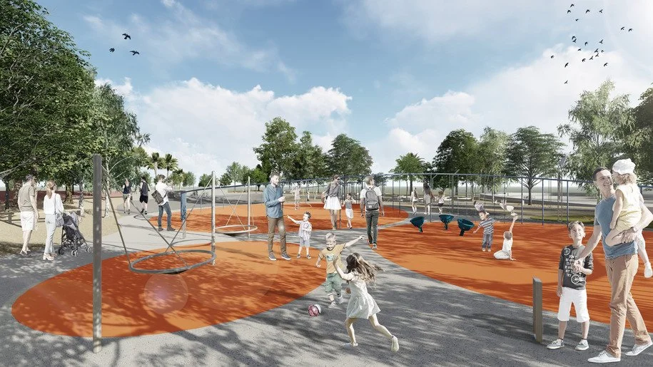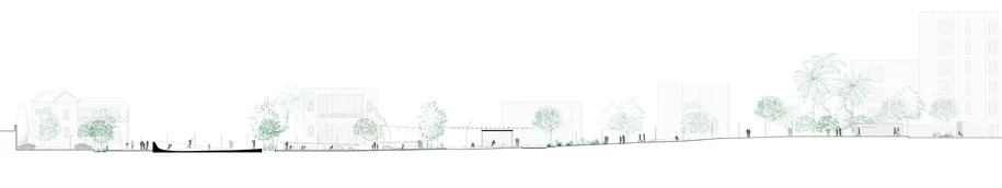 4. Παιδότοπος: στην καρδιά της ενότητας αυτής συντάσσεται ένας νέος δημόσιος χώρος, διαμορφωμένος από μια επιμήκη χωρική κατασκευή. Η «γλυπτική» προσέγγιση του παιδότοπου αποζητά να προσφέρει εύρος ελκυστικών δραστηριοτήτων παιχνιδιού.