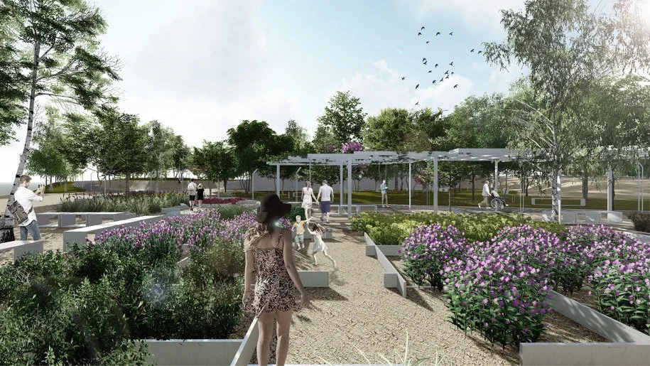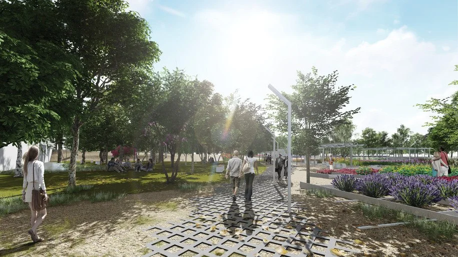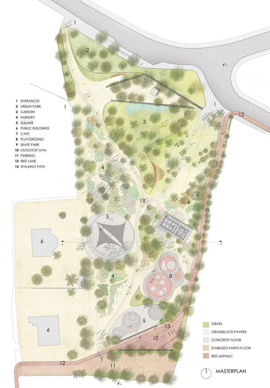 1. Αστικό Πάρκο: χωροθετείται στο ψηλό σημείο του τεμαχίου και αφορά την αλληλεπίδραση του πάρκου με την πόλη.